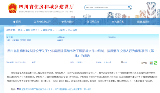 近日,四川省住建廳發(fā)布《關于公布房屋建筑和市政工程招標文件中限制、排斥潛在投標人行為典型事例(第一批)的通告》。