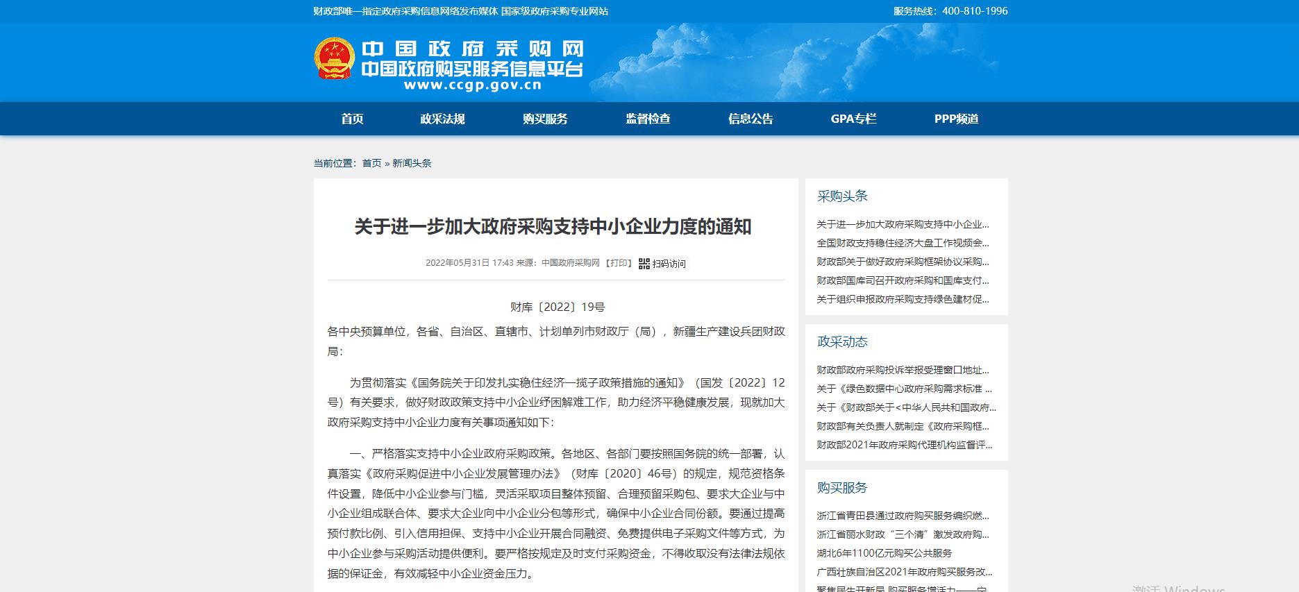 為貫徹落實(shí)《國(guó)務(wù)院關(guān)于印發(fā)扎實(shí)穩(wěn)住經(jīng)濟(jì)一攬子政策措施的通知》(國(guó)發(fā)〔2022〕12號(hào))有關(guān)要求,做好財(cái)政政策支持中小企業(yè)紓困解難工作,助力經(jīng)濟(jì)平穩(wěn)健康發(fā)展,現(xiàn)就加大政府采購(gòu)支持中小企業(yè)力度有關(guān)事項(xiàng)通知...