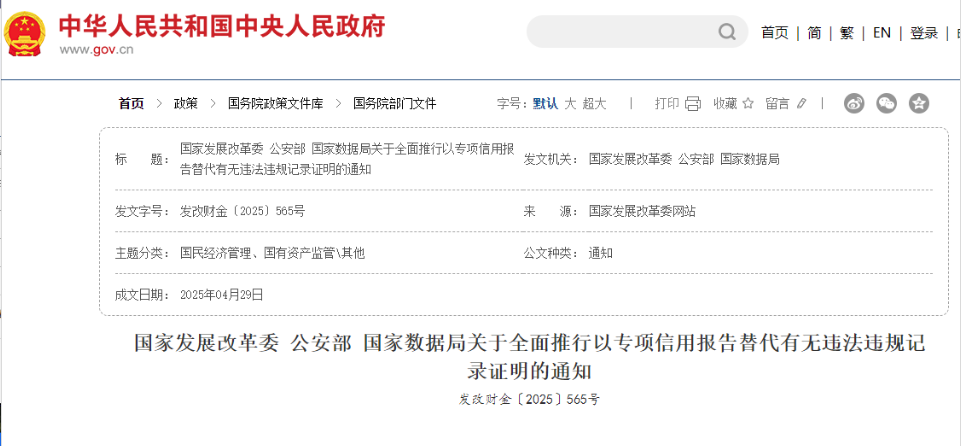 國(guó)家發(fā)展改革委 公安部 國(guó)家數(shù)據(jù)局關(guān)于全面推行以專項(xiàng)信用報(bào)告替代有無(wú)違法違規(guī)記錄證明的通知 發(fā)改財(cái)金〔2025〕565號(hào) 各省、自治區(qū)、直轄市、新疆生產(chǎn)建設(shè)兵團(tuán)社會(huì)信用體...