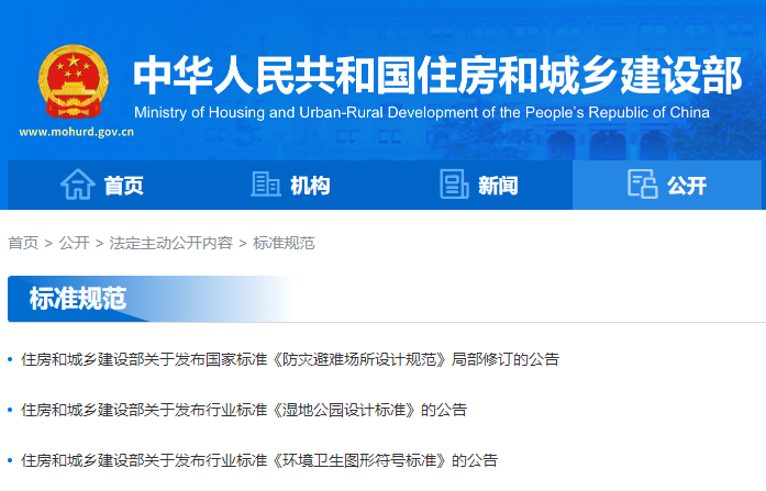 近日,住房和城鄉(xiāng)建設(shè)部發(fā)布《濕地公園設(shè)計(jì)標(biāo)準(zhǔn)》《環(huán)境衛(wèi)生圖形符號(hào)標(biāo)準(zhǔn)》以及對(duì)《防災(zāi)避難場(chǎng)所設(shè)計(jì)規(guī)范》局部修訂的公告。